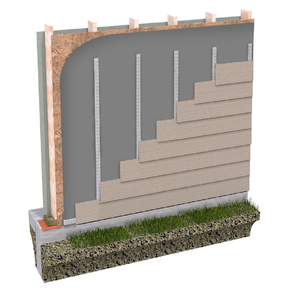 - Vertical channels for proper drainage and ventilation from the backside of the cladding to the front side of the sheathing.